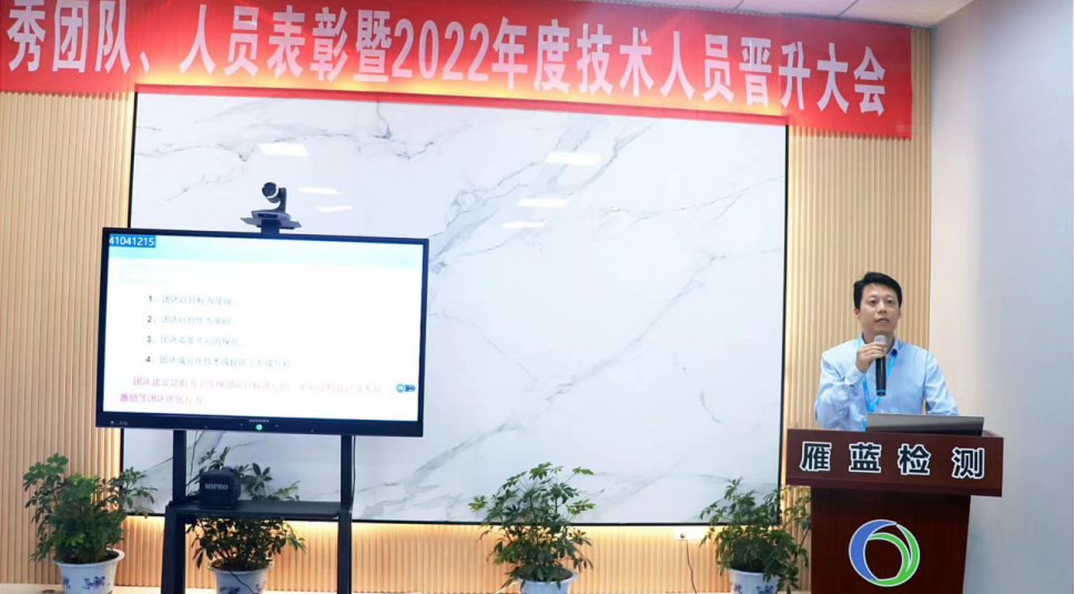 2022年5月13日,雁藍檢測在江寧本部召開2021年度表彰暨2022年度職務晉升大會。公司總經理張布偉、副總經理蔡同鋒,江寧本部和江北分場所相關人員參加會議,會議由副總經理周君主持。